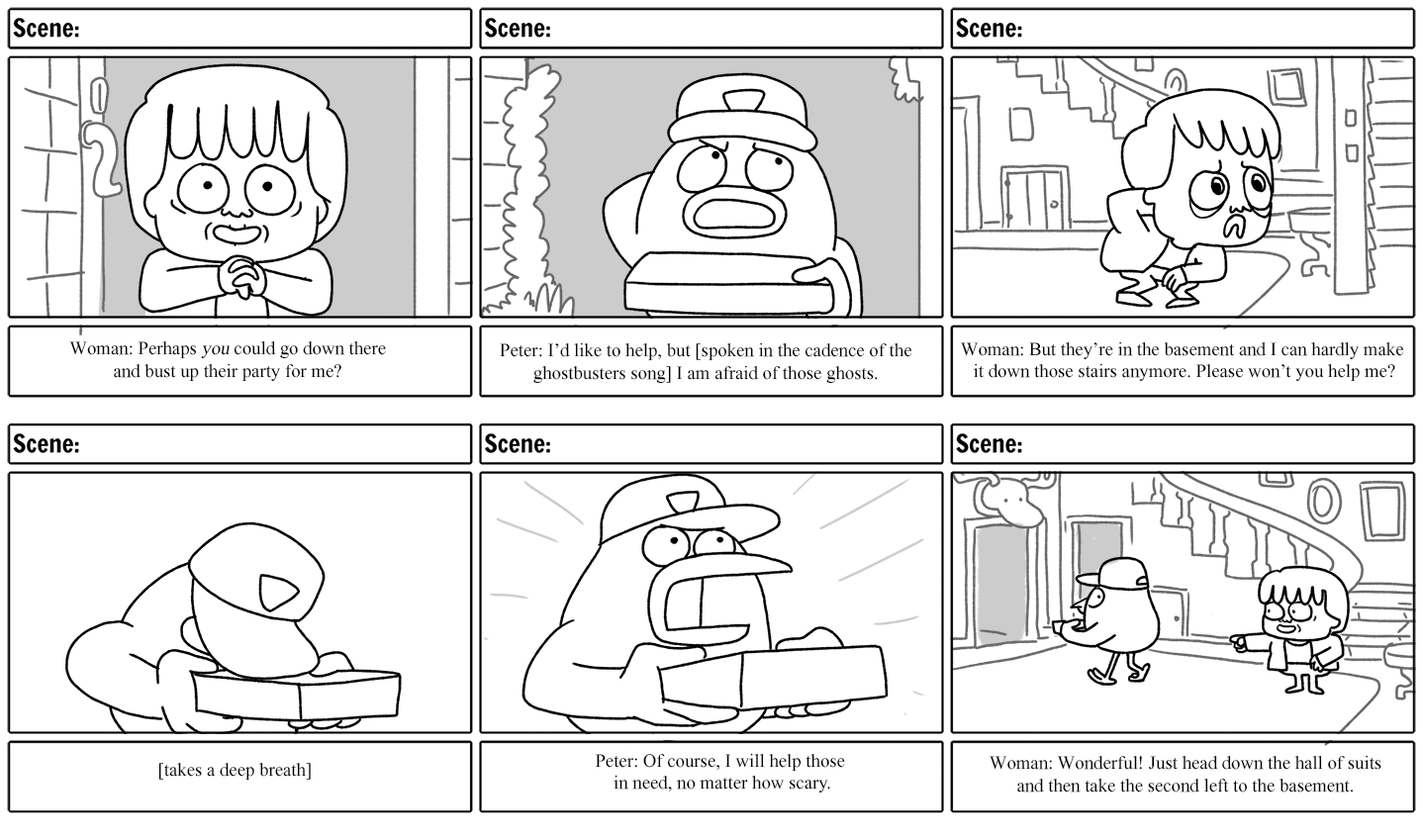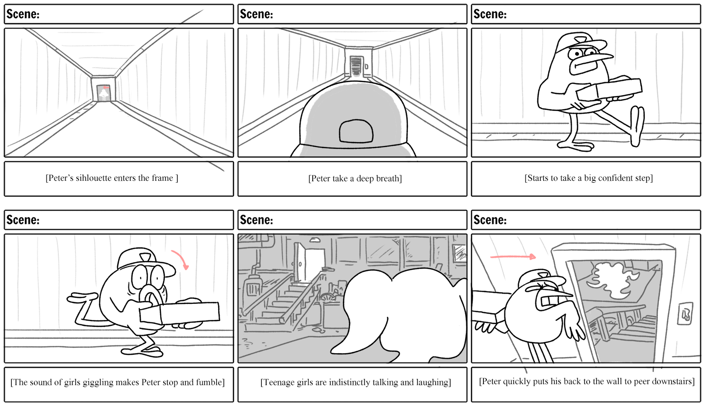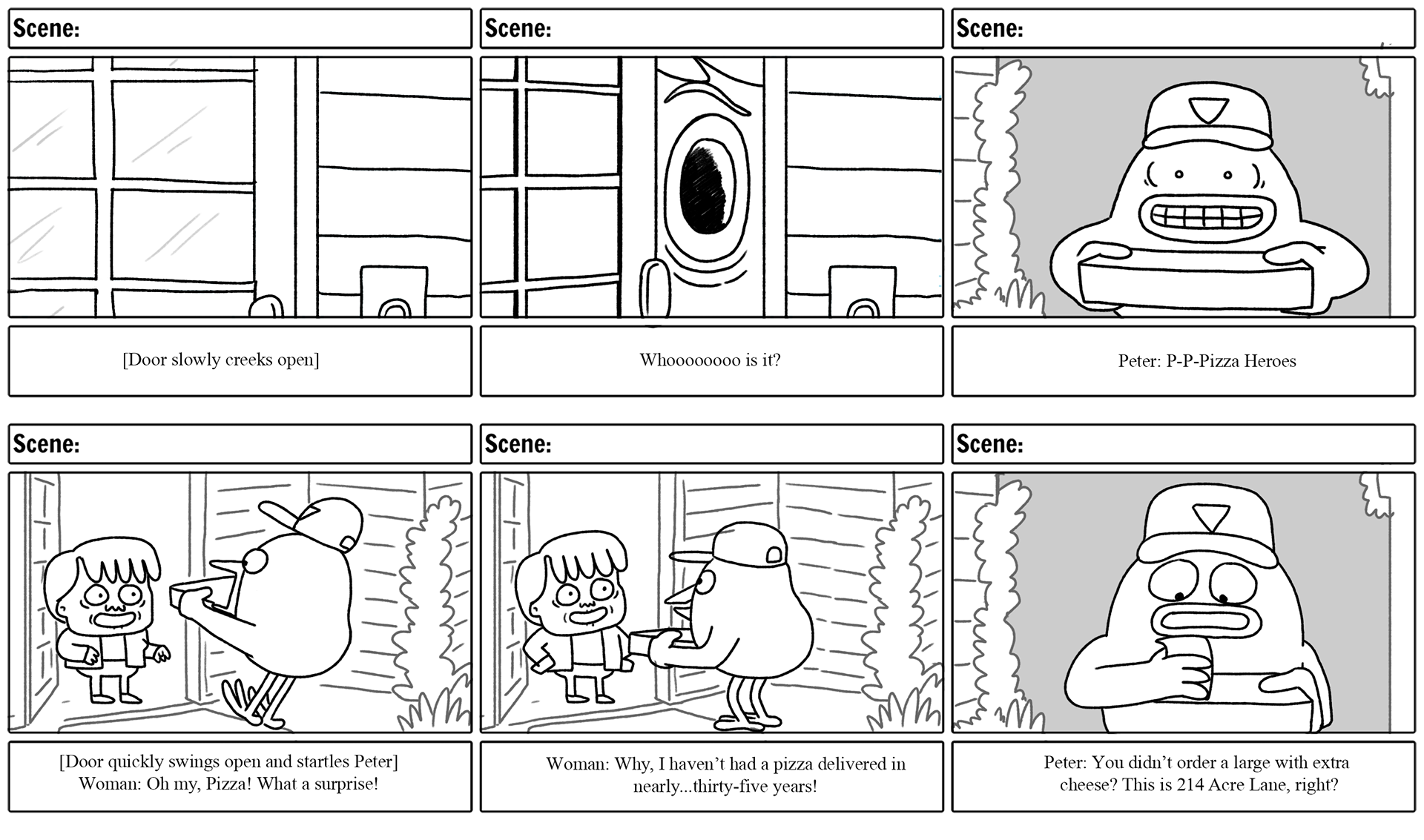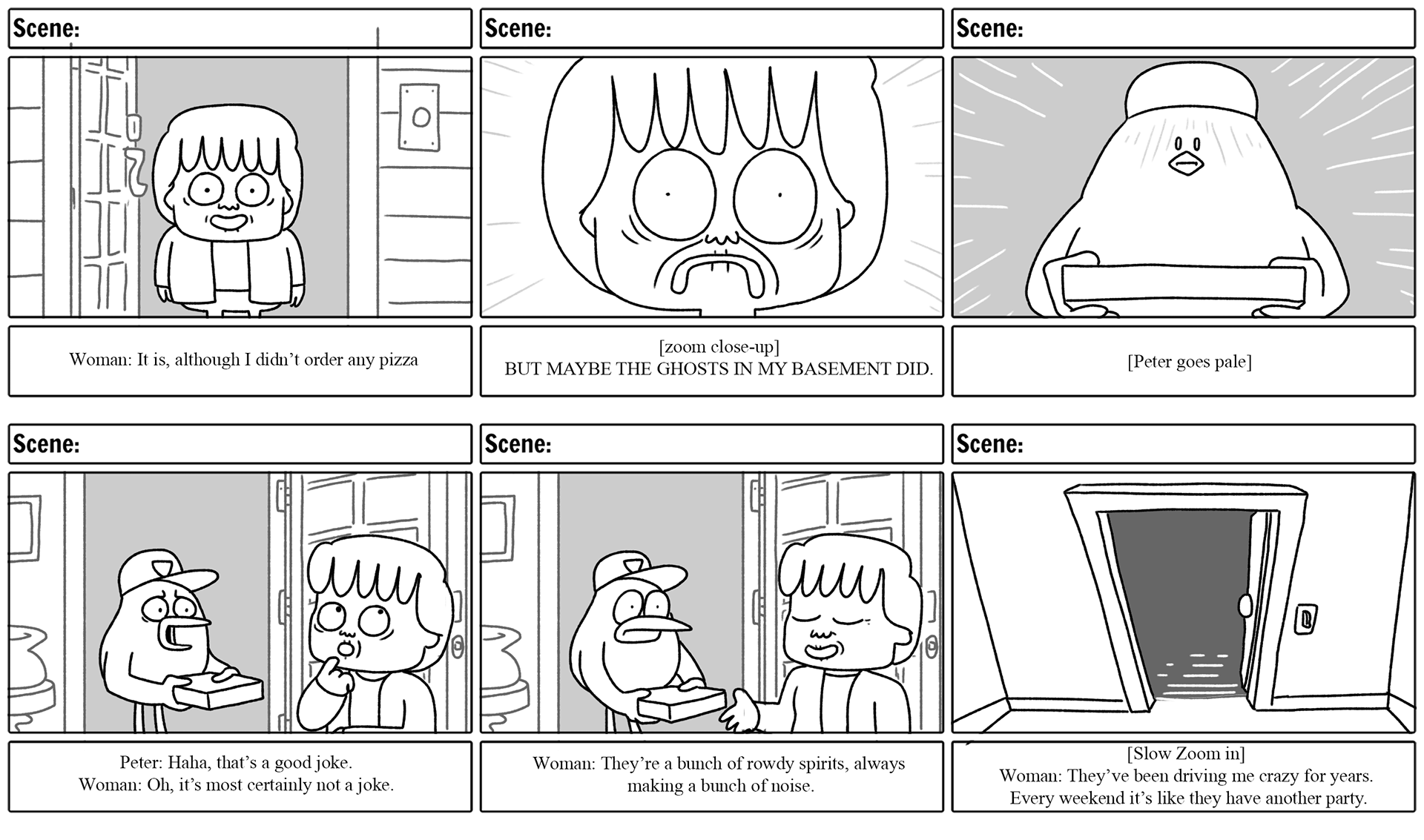 This is a storyboard pitch for a short 3-5 minute animation about Peter, a bird who's anxious but eager to help out the people to whom he's delivering pizzas.