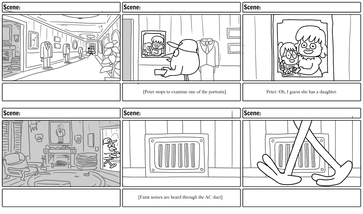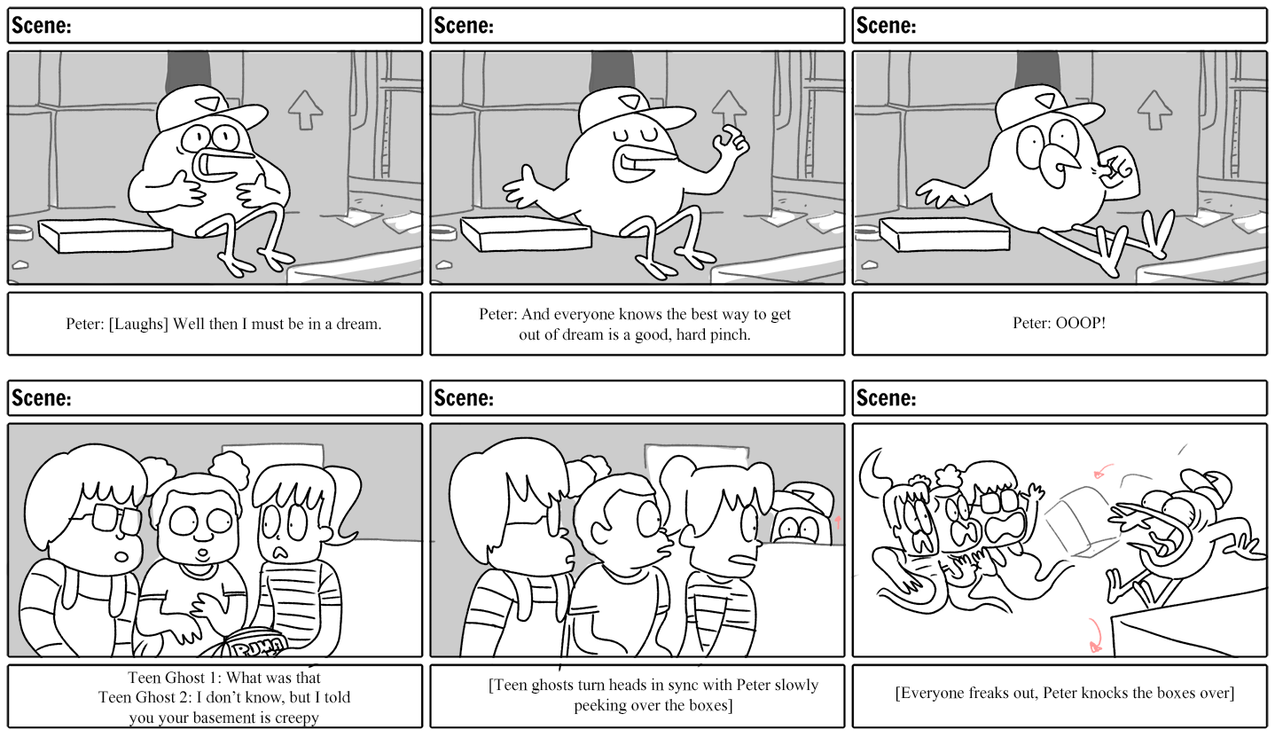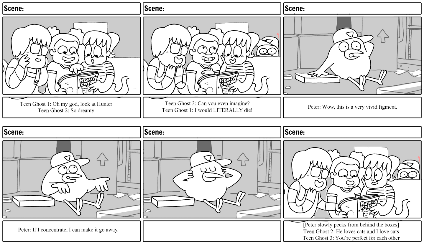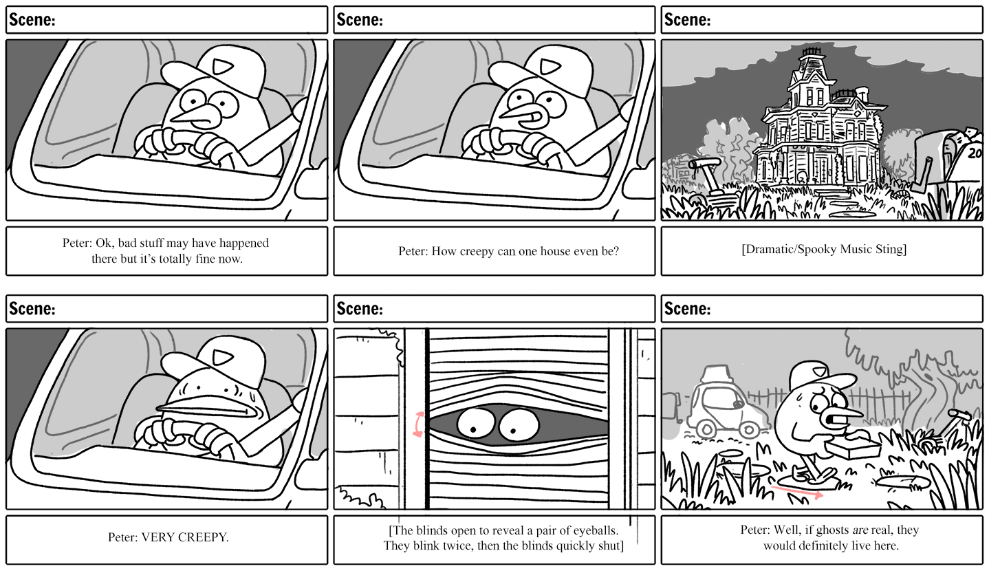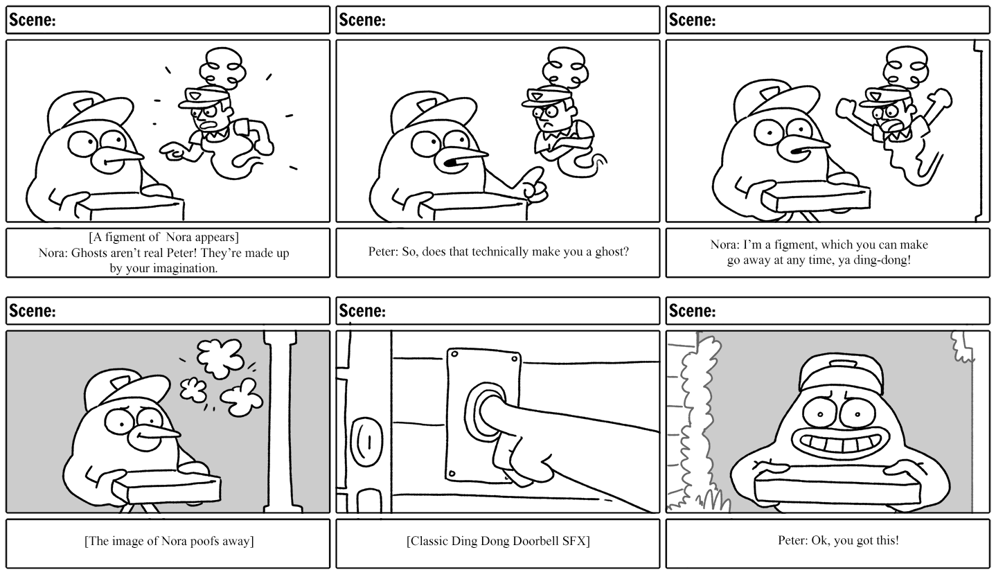 This is a storyboard pitch for a short 3-5 minute animation about Peter, a bird who's anxious but eager to help out the people to whom he's delivering pizzas.